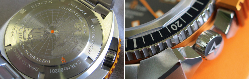 Нека Ви разкажем малко повече за този изключителен часовник. Модел, създаден с чест на 130 годишнината от създаването на семейната компания Edox, е смел и различен. Оранжевия протектор решава един стар проблем - как да се предпази по-добре коронката от екстремните външни влияния, а същевременно с това дава един свеж нов цялостен вид и би бил полезен за предпазването на добре изпълнения в дизайнерско отношение корпус от случайни удари. “Master lock” заключването е изпълнено като допълнителен въртящ се пръстен видим под назъбения безел и добавя приятен контраст към матовия морскосин дисплей. Часовникът, както и неговият предшественик, са с водоустойчивост 50 АТМ - до 500 метра дълбочина, като стрелките и индексите са снабдени с луминисцентно покритие.